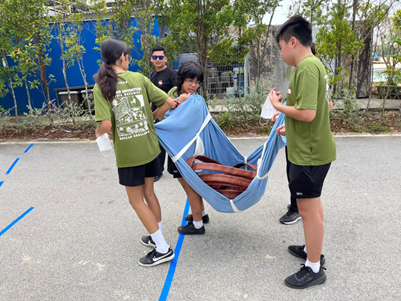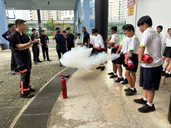 (Image above): Secondary One students trying to use fire extinguishers during the CCA Experience 2025.