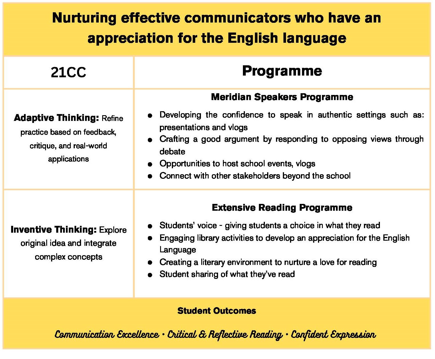 The English Department nurtures students' communication skills and literary appreciation through two key pathways: the Meridian Speakers Programme and the Extensive Reading Programme.