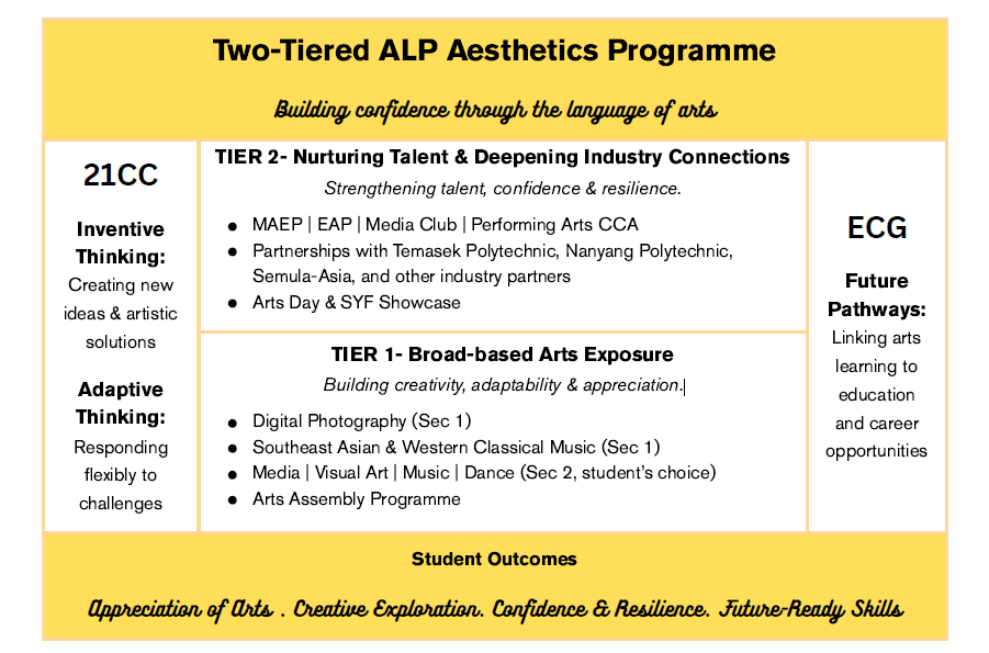 · Platforms such as ALP Arts Day and the Singapore Youth Festival (SYF), which allow students to showcase their talents publicly, building confidence and resilience.