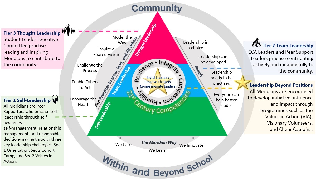 Meridian Secondary offers a multi-path, three-tier leadership training programme that allows students to develop leadership skills through Self-Leadership, Team Leadership and Thought Leadership. While the programme encourages students to progress through each level, they may be recognized for Tier 3 leadership roles based on their achievements, even if they have not completed Tier 2.