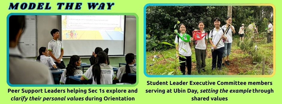 In Meridian, we believe that leadership can be learned. Our school aims to strengthen the character and values of all Meridians under a structured and differentiated Lifelong Learning Programme (LLP) in Community Youth Leadership (CYL). The school's Student Leadership programme reaches out to all students in the school. Programmes are designed to span across cohorts as well as differentiated groups to cater to students' interests, talents and needs. The school actively partners with external organisations to provide authentic and challenging learning experiences and assignments. At the heart of our leadership approach is Kouzes and Posner’s Five Practices of Exemplary Leadership, which guide students to grow, lead, and lift others. Meridians are encouraged to: Model the Way, Inspire a Shared Vision, Challenge the Process, Enable Others to Act, and Encourage the Heart as they develop into confident and values-driven leaders.