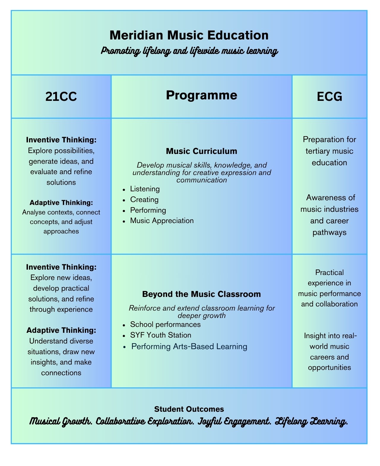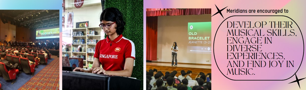 The Meridian Music curriculum aims to promote lifelong and lifewide music learning through nurturing the innate musical ability in every student. With the wide range of programmes offered, students are given opportunities to discover, collaborate, and find the joy of music.